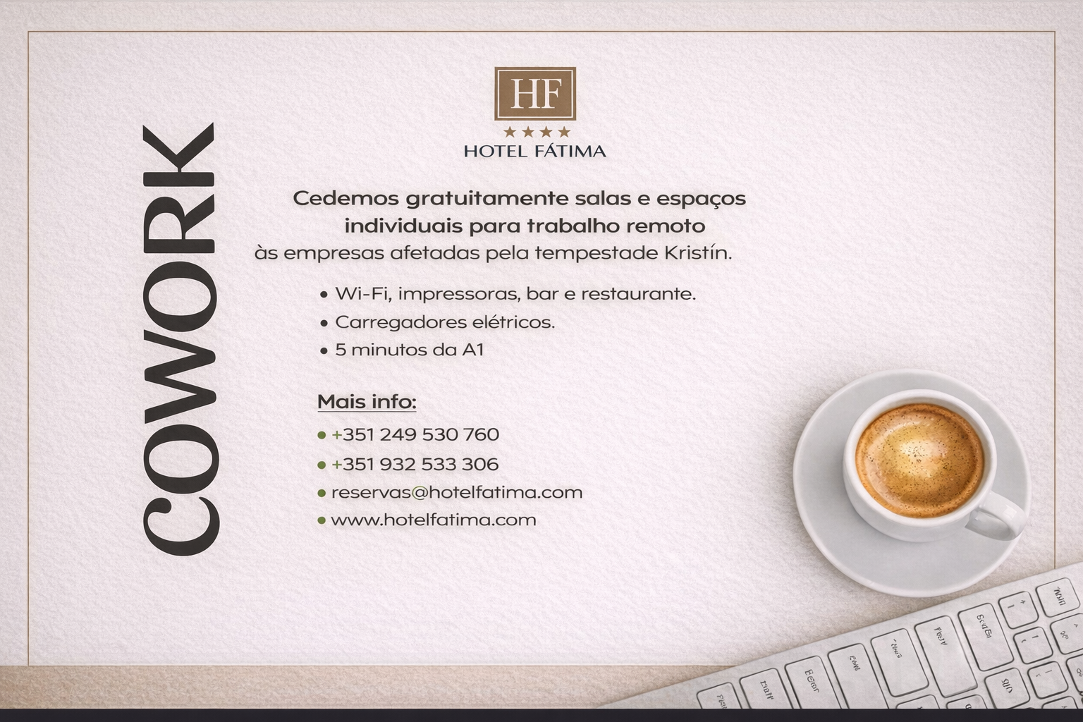 A par de um ambiente tranquilo e requintado, encontrará no Hotel Fátima uma equipa experiente e dedicada, pronta a responder às suas solicitações!